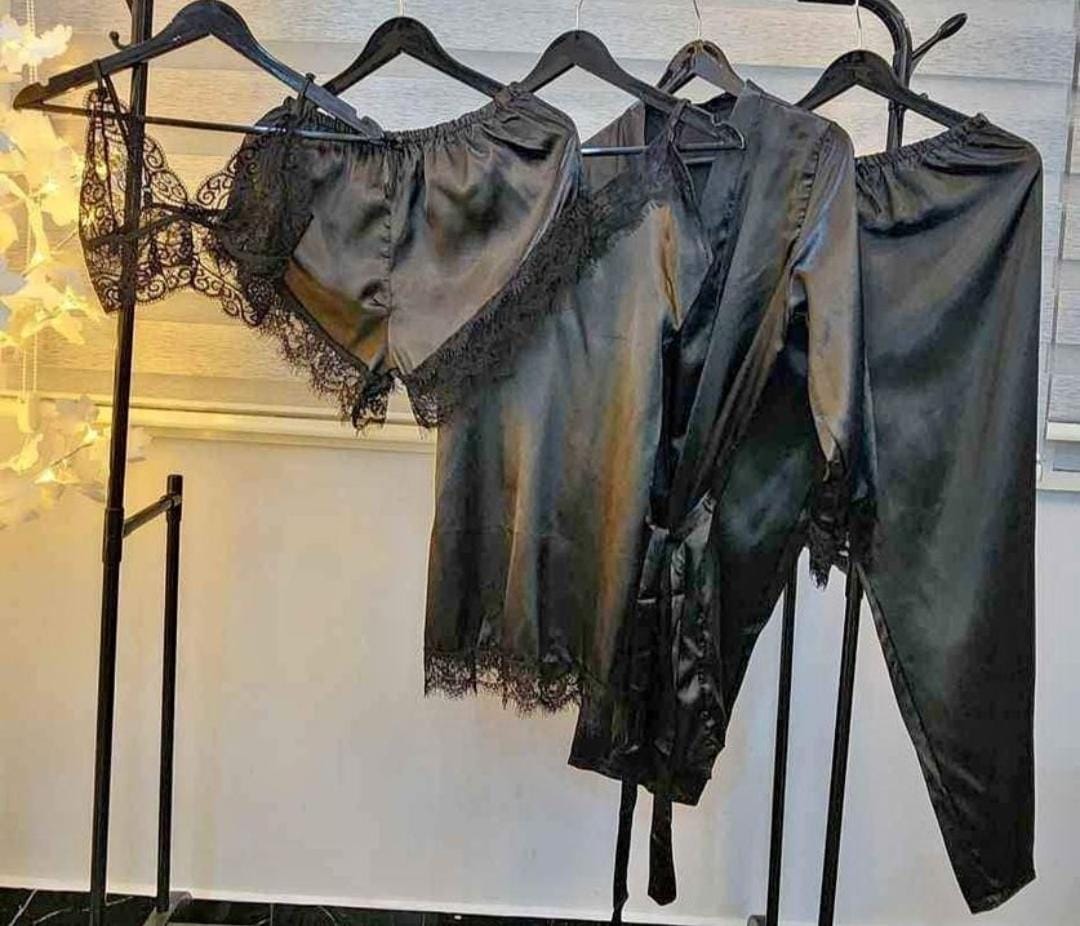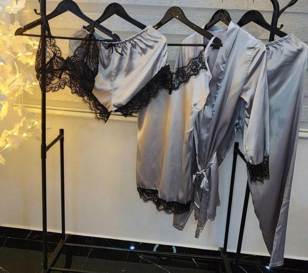 CONJUNTO DE PIJAMAS 5 PIEZAS DE MUJER TALLA L Y M EN COLORES NEGRO, GRIS Y DORADO Chatea con nosotros al 0979989844 INCLUYE BATA PANTALÓN SHORT TOP BLUSA