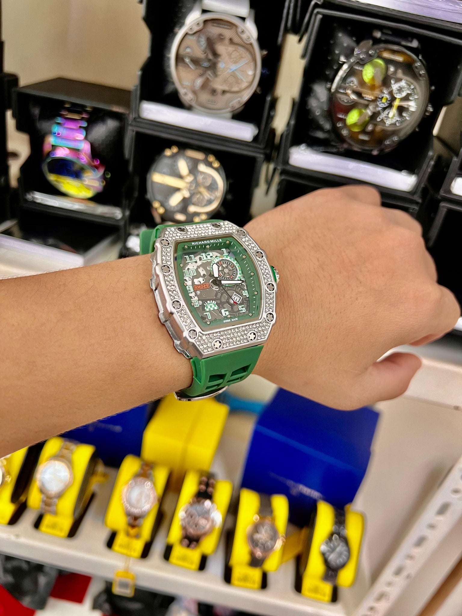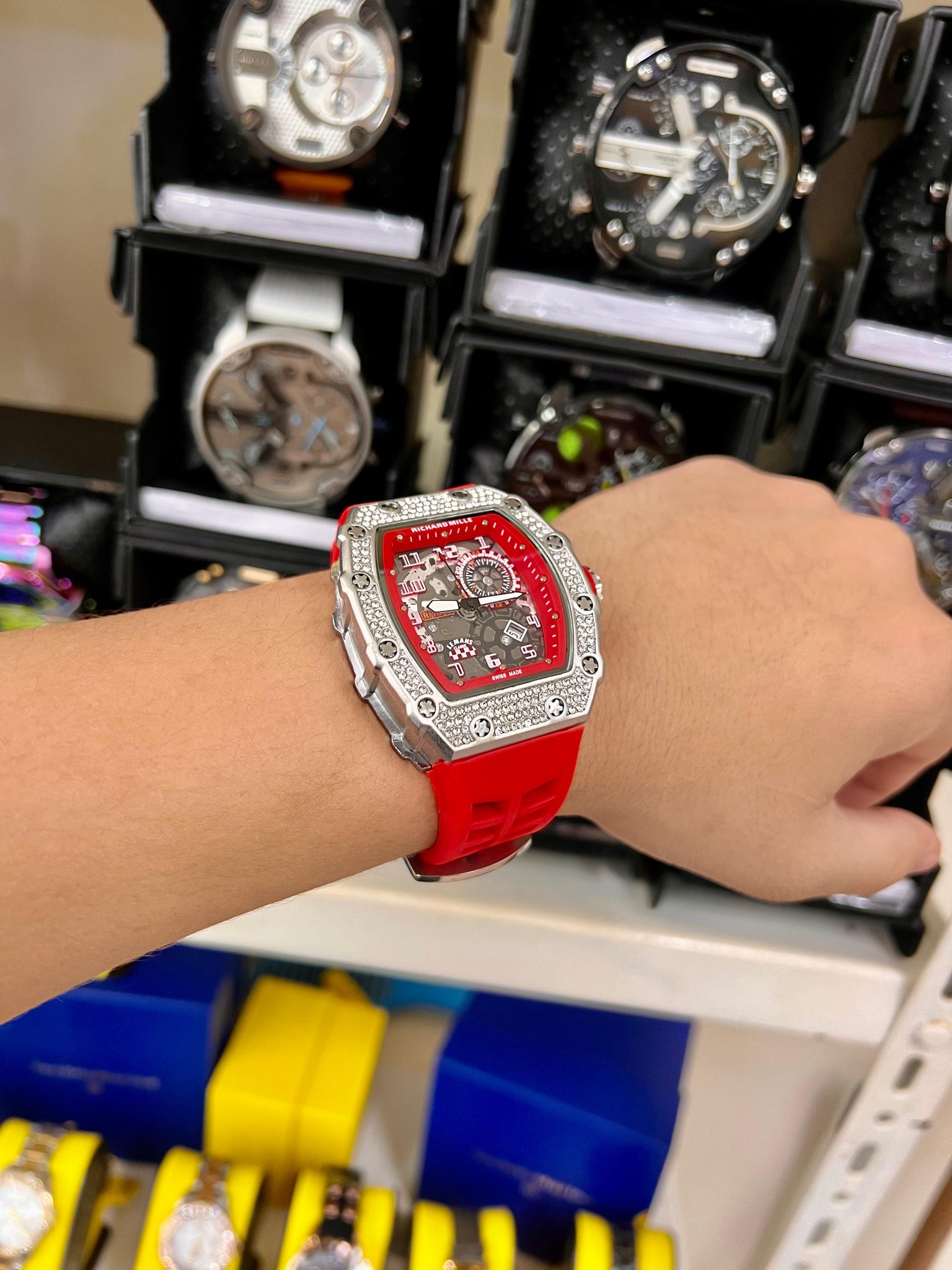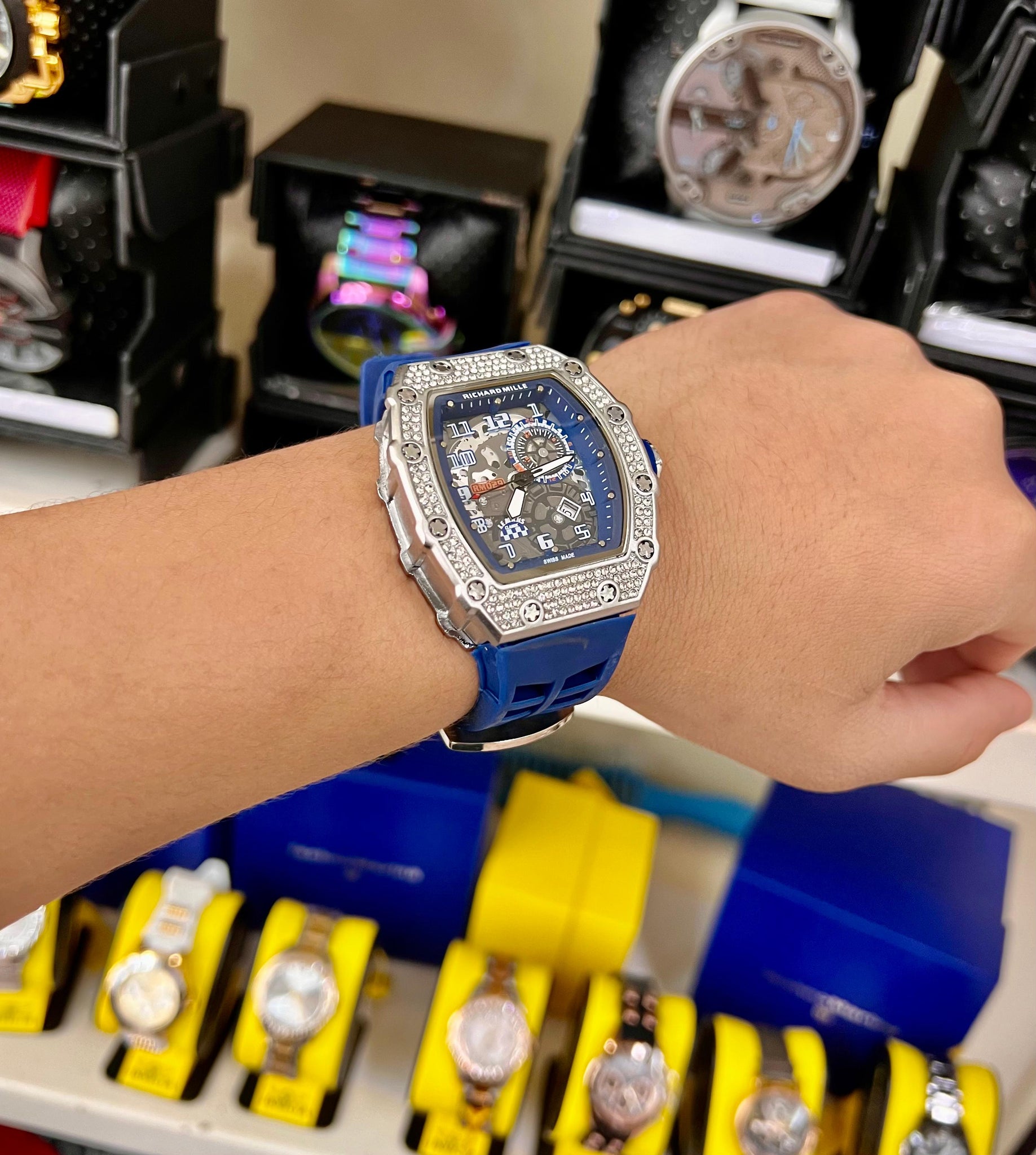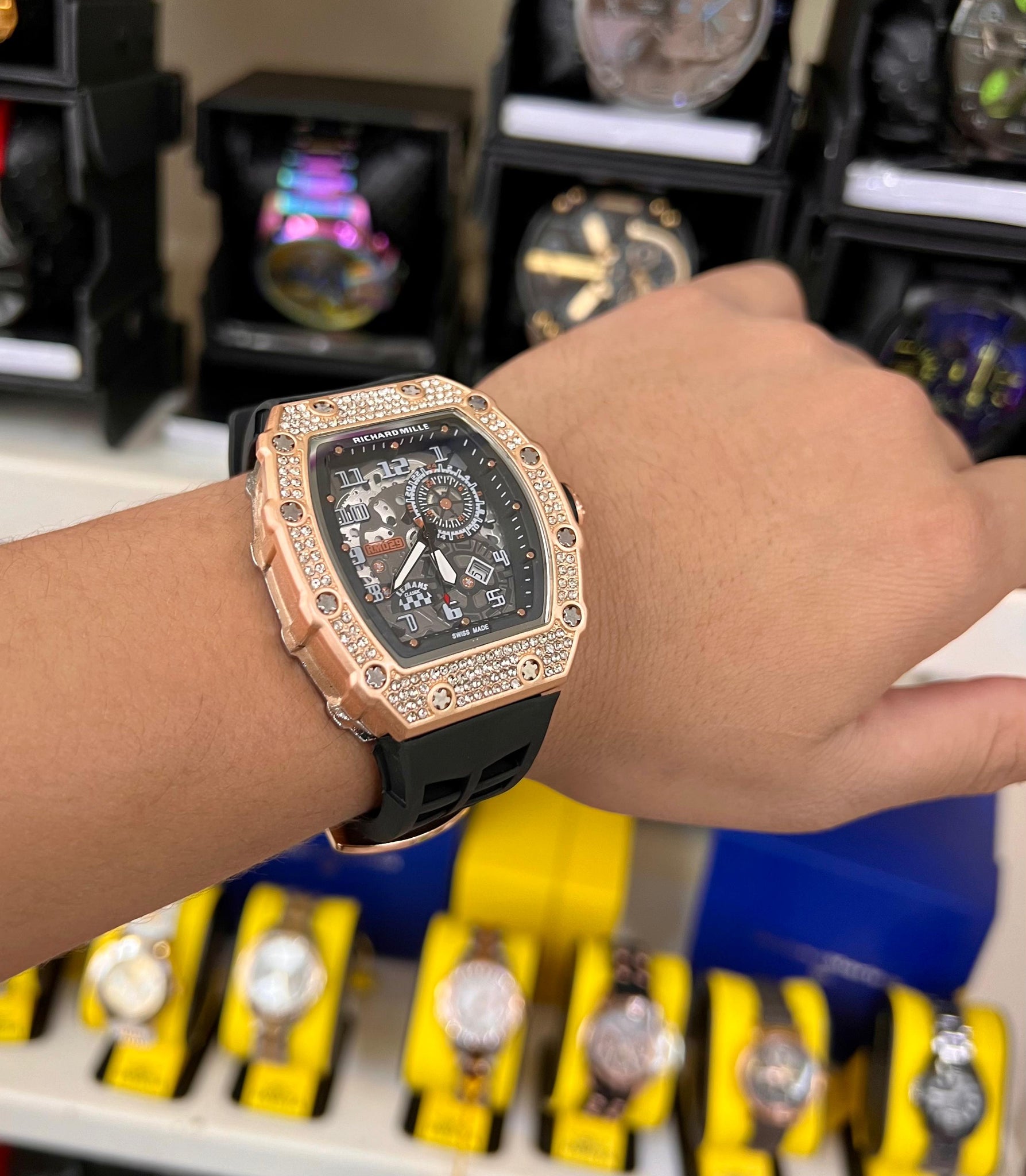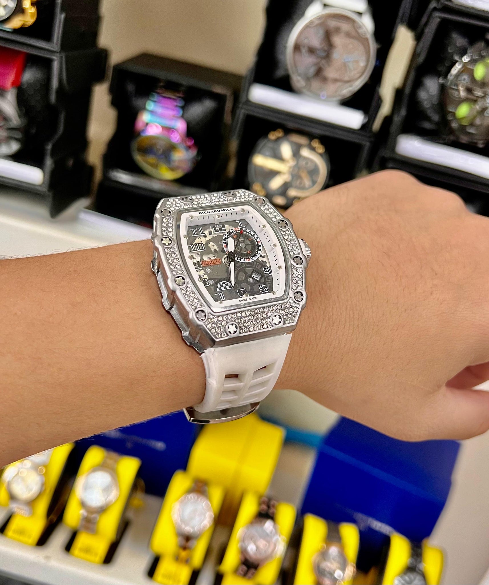 Diseño y Estilo:El reloj Richard Mille es una pieza excepcionalmente diseñada para quienes buscan destacar. Su caja de forma angular es robusta, pero a la vez elegante, con un acabado metálico pulido que resalta su presencia. Lo que realmente lo hace único son las piedras preciosas incrustadas en la parte superior de la caja, que añaden un toque de lujo y sofisticación, convirtiéndolo en una verdadera joya de la relojería. El reloj está disponible en una variedad de colores vibrantes de correas de goma, que incluyen verde, rojo, blanco, azul y rosa, cada uno con su propio estilo audaz que permite adaptarse a cualquier personalidad.Calidad de Materiales:Este reloj ha sido fabricado con materiales de alta gama, comenzando con su caja de acero inoxidable o material similar, que se combina con detalles en diamantes y piedras preciosas incrustadas alrededor de la caja, aumentando la durabilidad y el brillo de la pieza. La correa de goma, que ofrece una experiencia de uso cómoda y ajustada, también es resistente y práctica, ideal para los que buscan un accesorio de lujo que no sacrifique la funcionalidad.Funcionalidad y Movimiento:El reloj Richard Mille no solo destaca por su estética, sino también por su precisión. El dial es sofisticado y de fácil lectura, con múltiples complicaciones que aseguran una medición del tiempo exacta. Además, el diseño de la esfera, que presenta una estructura compleja, refleja la artesanía detrás de la construcción del reloj. Es ideal para quienes buscan una pieza que no solo sea visualmente atractiva, sino que también ofrezca un rendimiento de alta calidad.Colores y Versatilidad:La gama de colores disponibles es un factor clave que permite a los usuarios personalizar su estilo. Los modelos con correa verde y roja aportan un toque deportivo y juvenil, mientras que las opciones con correa blanca, azul o rosa brindan una estética más pulida y sofisticada. Cada color combina perfectamente con los detalles brillantes de la caja, asegurando que el reloj se adapte a distintas ocasiones, ya sean eventos formales o casuales, sin perder su estilo y exclusividad.Exclusividad y Estilo de Vida:Este reloj es mucho más que un accesorio, es una declaración de estilo y éxito. Ideal para quienes buscan mostrar una imagen audaz y sofisticada, el reloj Richard Mille con piedras es sinónimo de exclusividad y elegancia. Al ser una pieza limitada y de alta gama, es perfecto para aquellos que desean destacar en cualquier entorno, ya sea en reuniones de negocios o eventos sociales. Cada modelo representa no solo el buen gusto, sino también un estilo de vida que valora lo único, lo exclusivo y lo atemporal. 0979989844